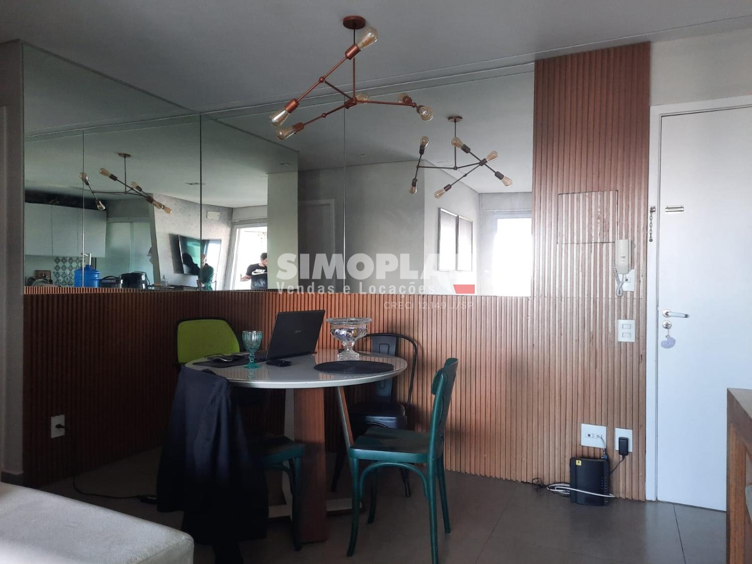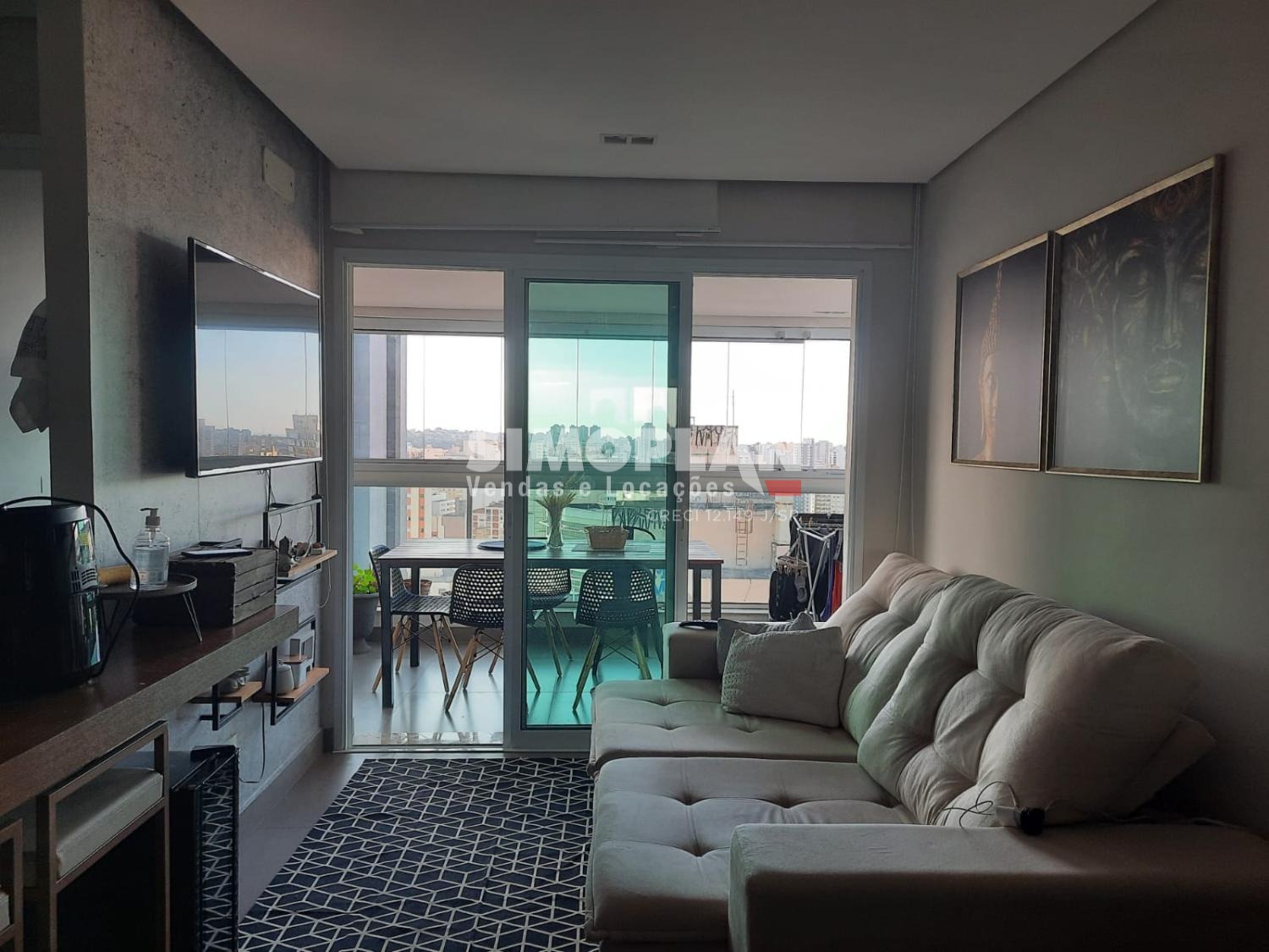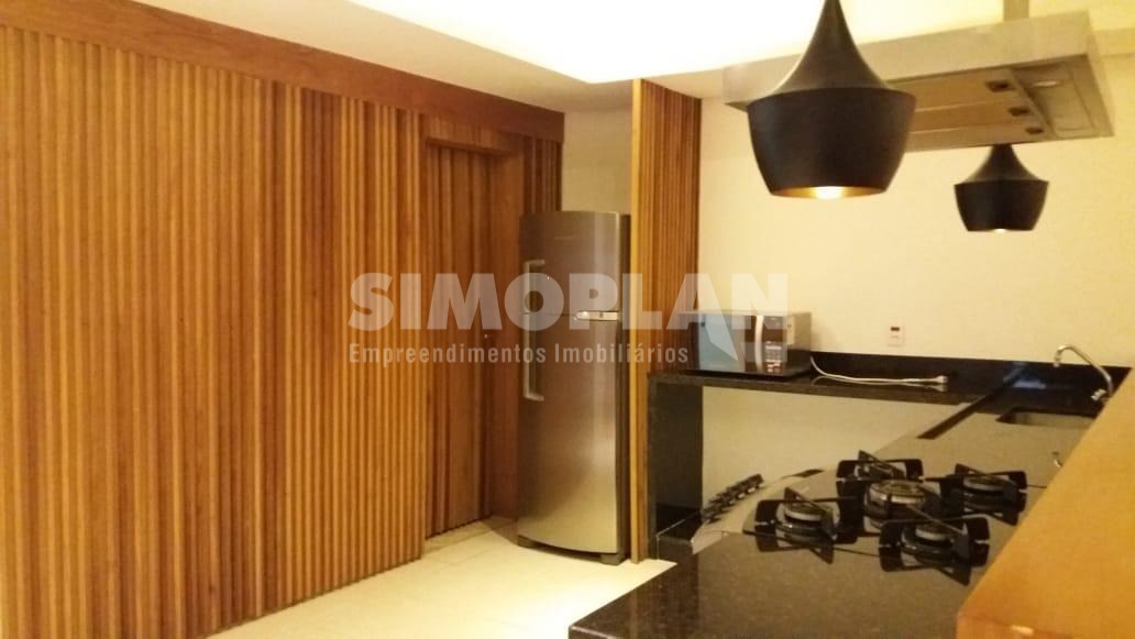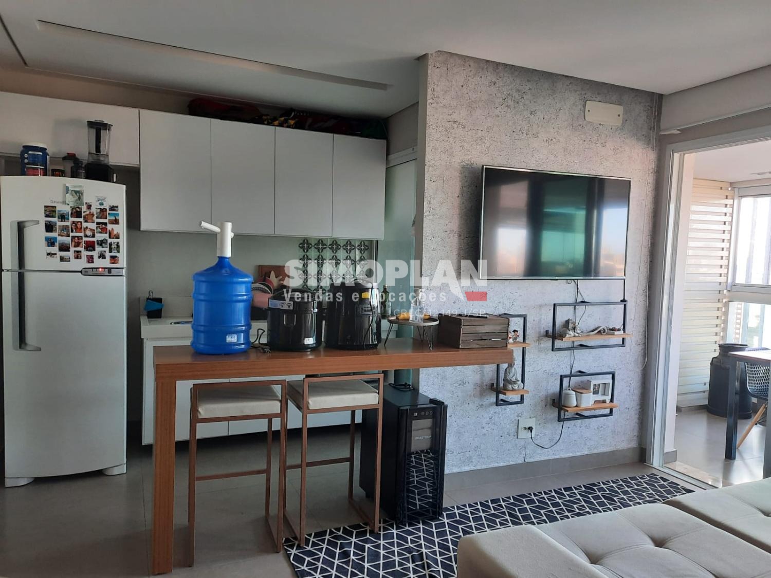Living para 2 ambientes com revestimento em madeira, espelhos e varanda gourmet com churrasqueira. Possui Hack para TV com teto de gesso e iluminação embutida. Cozinha americana planejada com cooktop e area de serviço com armario e aquecedor a gas. Area intima com 2 dormitorios planejados sendo 1 suite com closet.