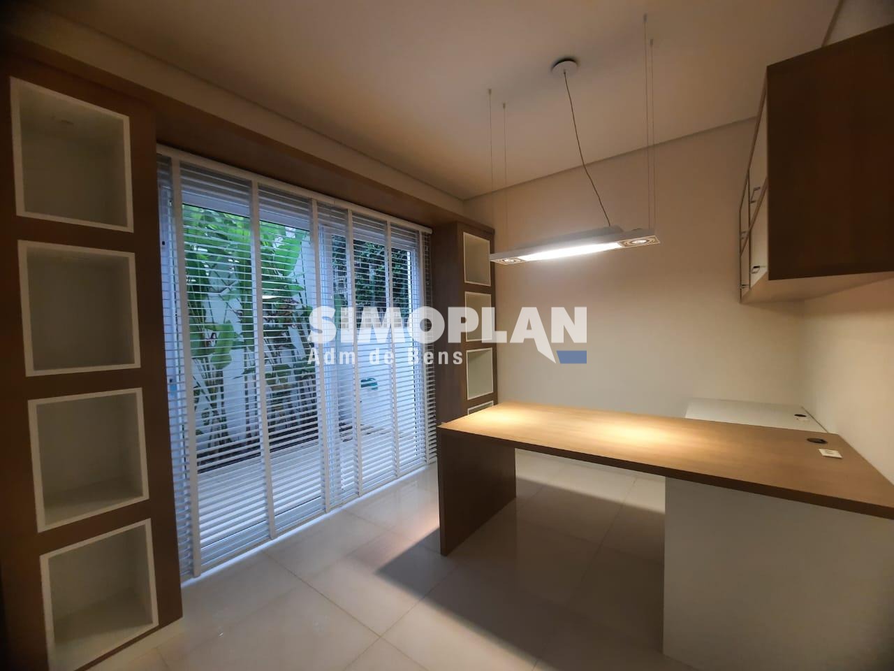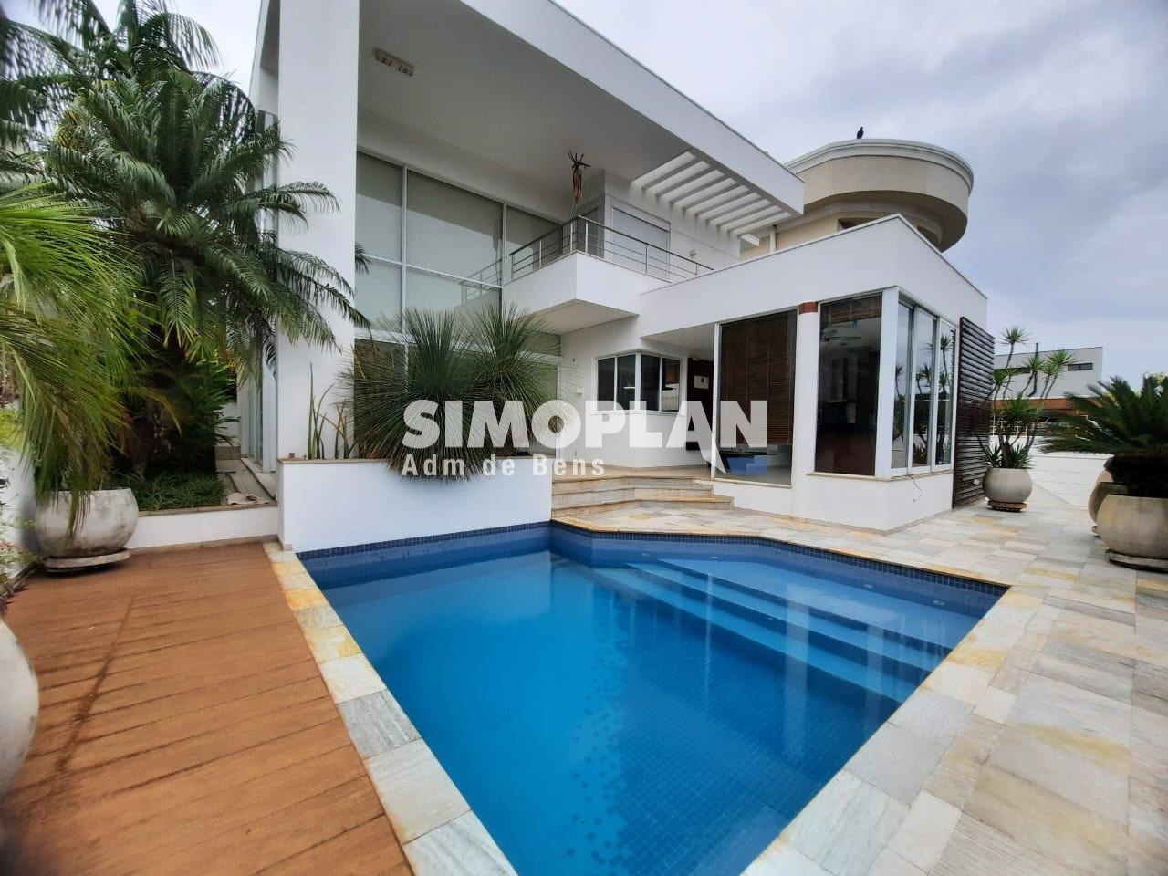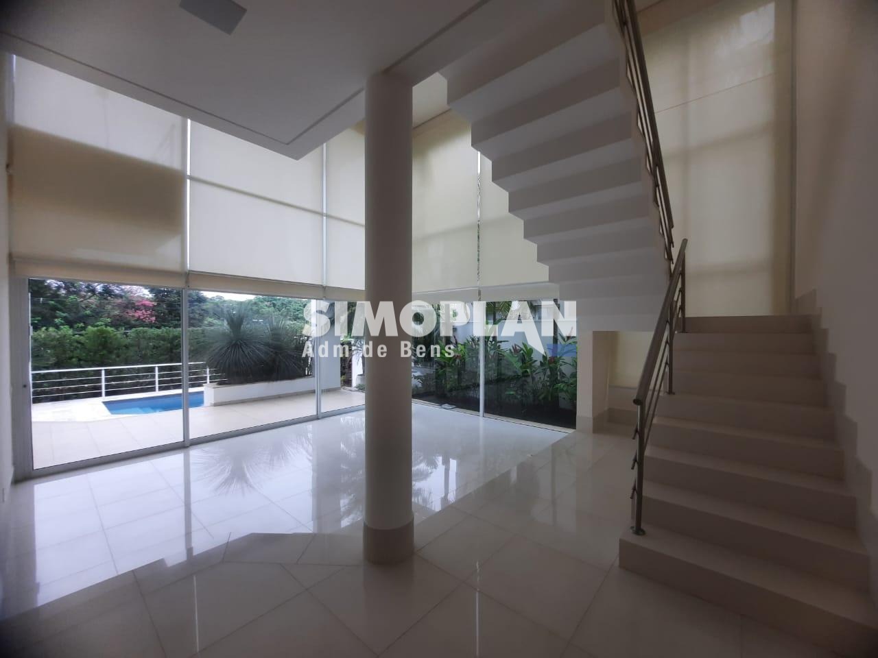 Sendo um sobrado, o imóvel é composto no piso inferior com 1 suíte com arma´rios, sala de estar e jantar com pé direito duplo, lavabo, sala de TV, escritório, cozinha planejada, dependência de empregada com banheiro, lavanderia, área gourmet com churrasqueira e armários, banheiro na área externa e piscina.